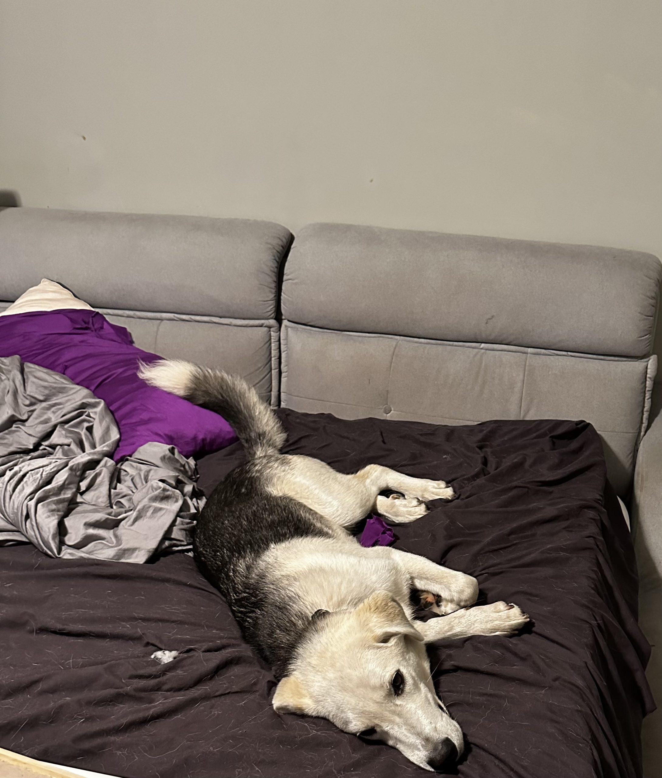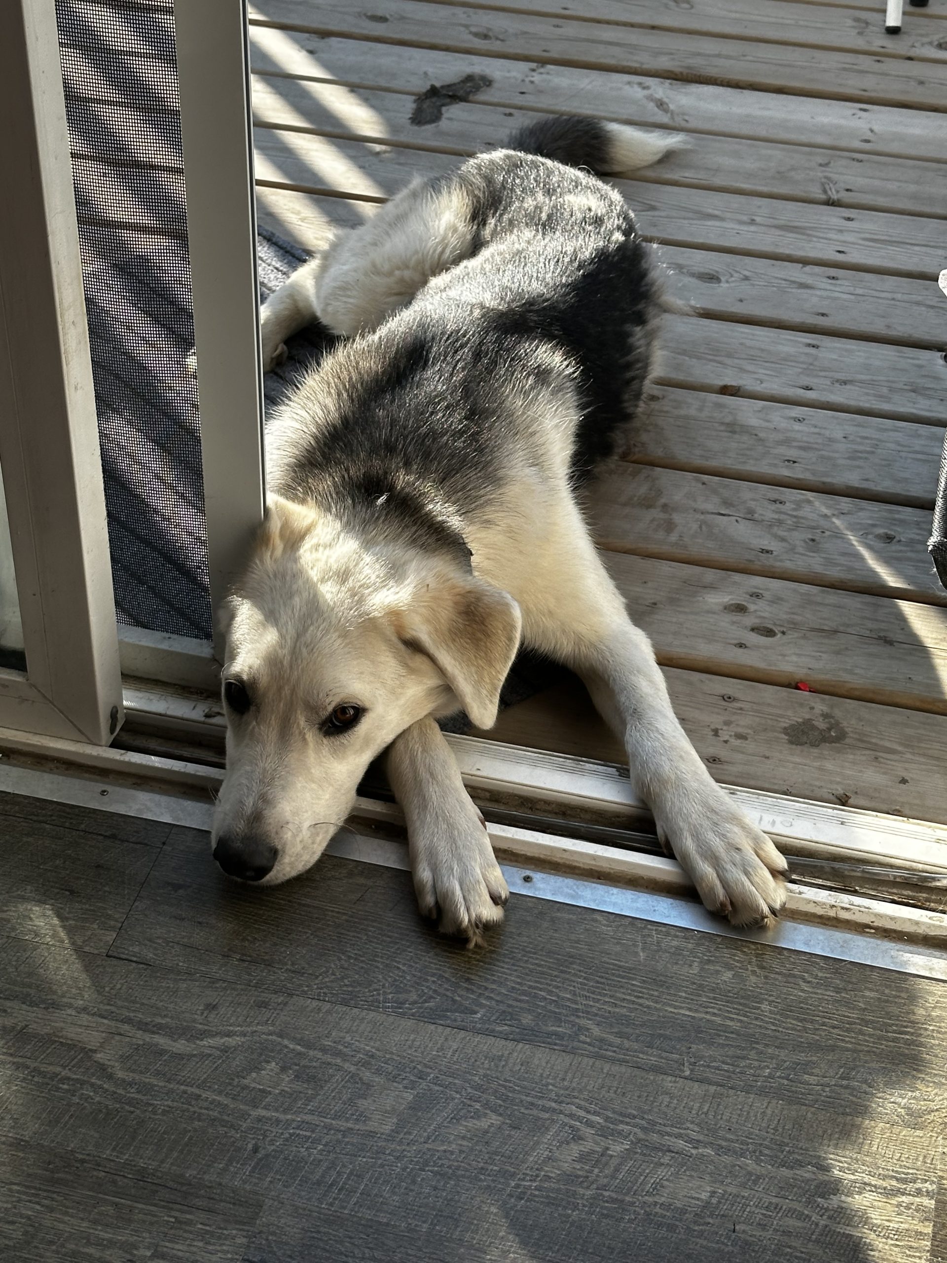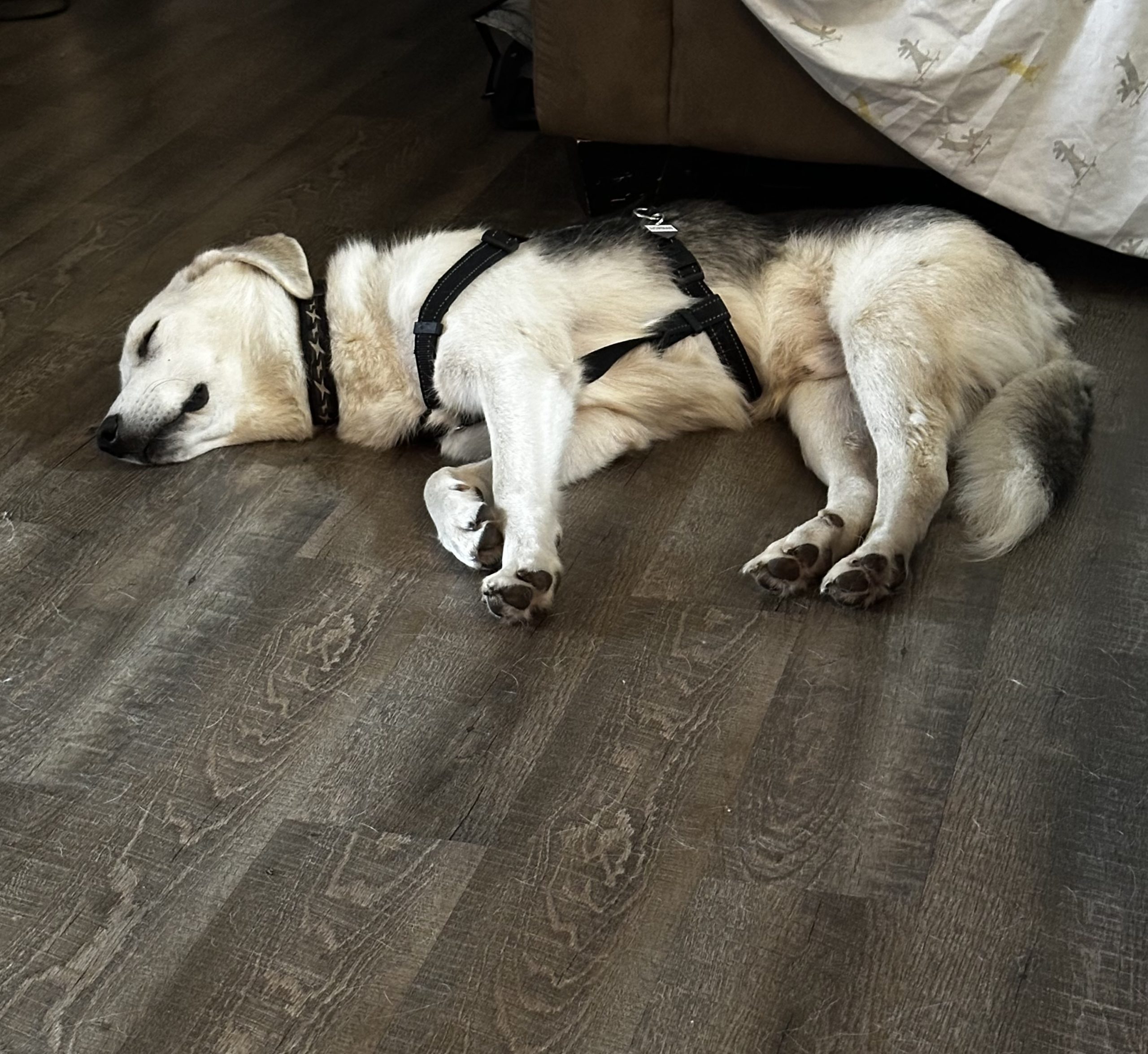 When I’m not running around with my dog friend or playing with the kids, I like to lie down on the couch or curl up under the deck to relax. I don’t love being crated, so I usually hang out in the living room when my foster family is out. I’m a pretty chill guy when left alone, and I just like to take it easy.